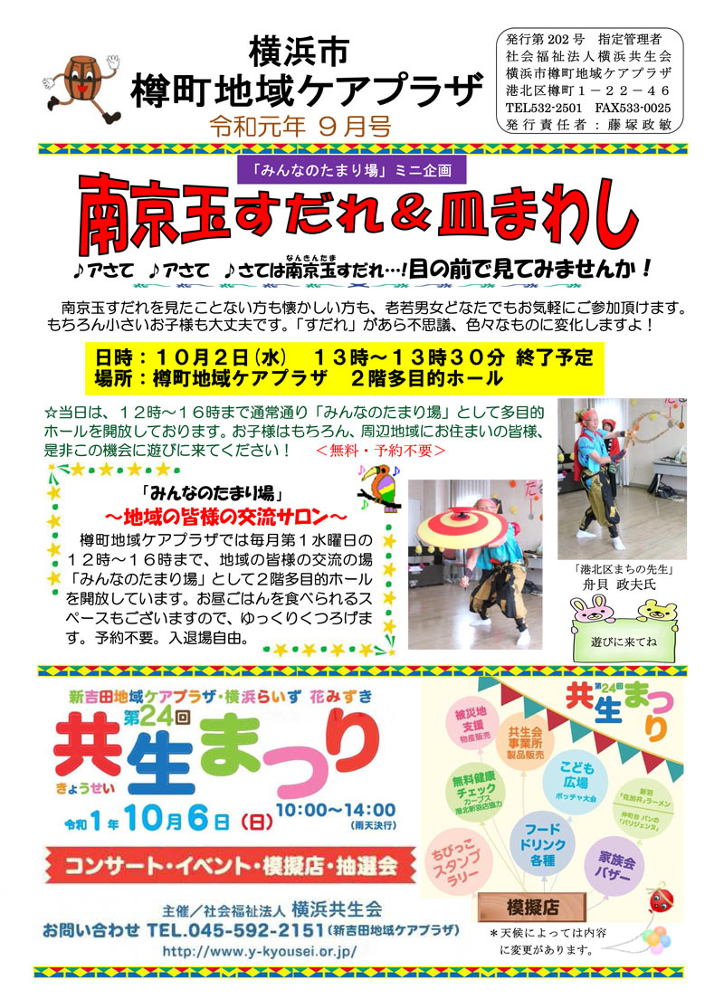 ・樽町地域ケアプラザからのお知らせ(2019年9月号・2面)~みんなのたまり場特別企画「夏まつり」報告、2019年9月・10月前半のイベントカレンダー他