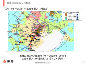 このような開発を進めてきた結果、当社沿線エリアでは2011(平成23)年比で武蔵小杉を筆頭に渋谷区、品川区、目黒区において、生産年齢人口が増加している傾向を読み取ることができます。
