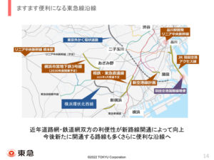 開通によって、渋谷駅と新横浜駅の間は乗り換えなしの約30分で到着することができ、東急線沿線エリアの交通利便性、都心エリアとの連携性が向上、さらなる沿線価値の向上が見込まれます。