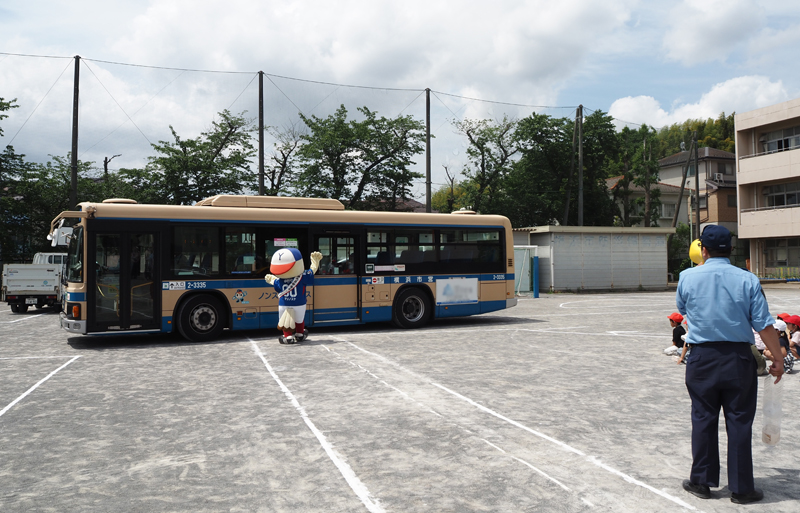 同小学校で参加した約190人の1年生と3年生児童、ボランティアで教室の運営を手伝った保護者らは、校庭内を走る路線バスの危険性を体感、運転席からの「死角」で周囲にいる多くの子どもたちの姿が確認できないことや、前輪と後輪の位置が異なり後輪にひかれる可能性がある「内輪差」の実演で、「横断歩道での信号待ちの際には、前の方には立ってはいけない」といった“身を守る”方法をリアルに学んでいました。