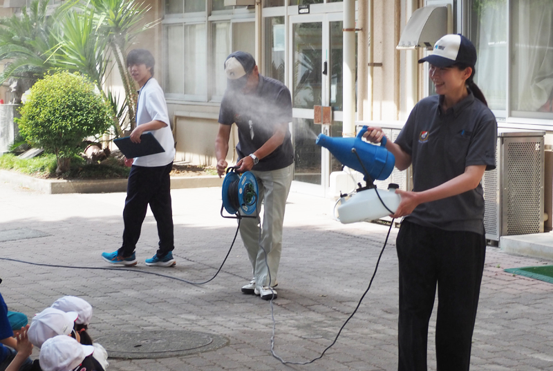 アネスト岩田株式会社(新吉田町)の渡辺さんと三矢さんが、同社の主力商品の「スプレーガン」(今回は他社商品とのこと)で暑さ対策のミストを児童に吹きかけるプレゼントも