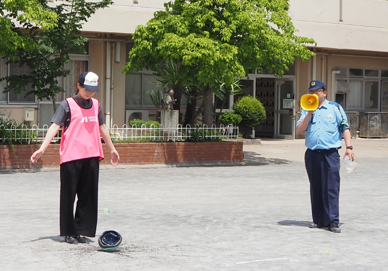F・マリノスの「オフィシャルパートナー」アネスト岩田株式会社(新吉田町)の渡辺貫矢さん三矢桃子さんも実施に協力、同社の主力商品の「スプレーガン」から、暑さ対策のミストを児童に吹きかける“アトラクション”(今回は他社商品を使用)や、「ヘルメット実験」の実演を行うなど、子どもたちのためにと笑顔を絶やさず、大切な学びの場を盛り上げていました。