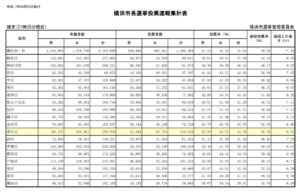 一方で南区(37.30%、同▲9.07ポイント)や鶴見区(37.68%、同▲6.50ポイント)、瀬谷区(39.01%、同▲6.69ポイント)、中区(39.74%、同▲8.68ポイント)、神奈川区(40.12%、同▲8.05ポイント)は低い投票率に終わりました。