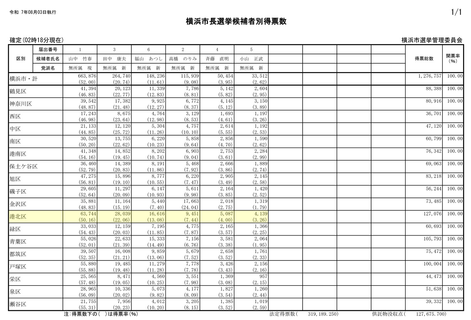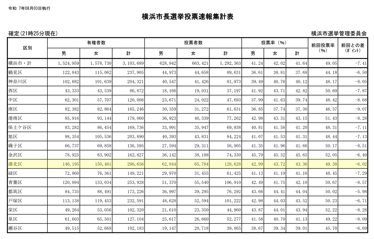 横浜市長選挙(令和7年8月3日執行)「投・開票速報」(横浜市選挙管理委員会)