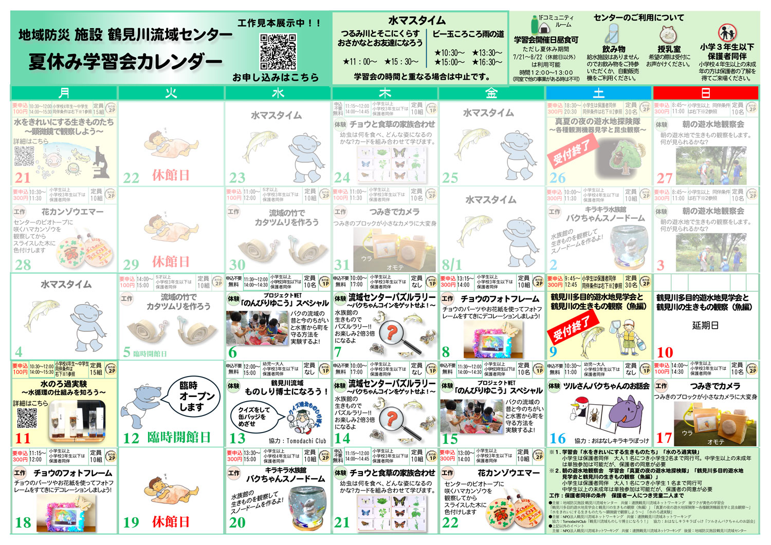 地域防災施設「鶴見川流域センター」の2025年夏休み学習会カレンダー(2025年8月22日までの予定表、※8月19日は休館)