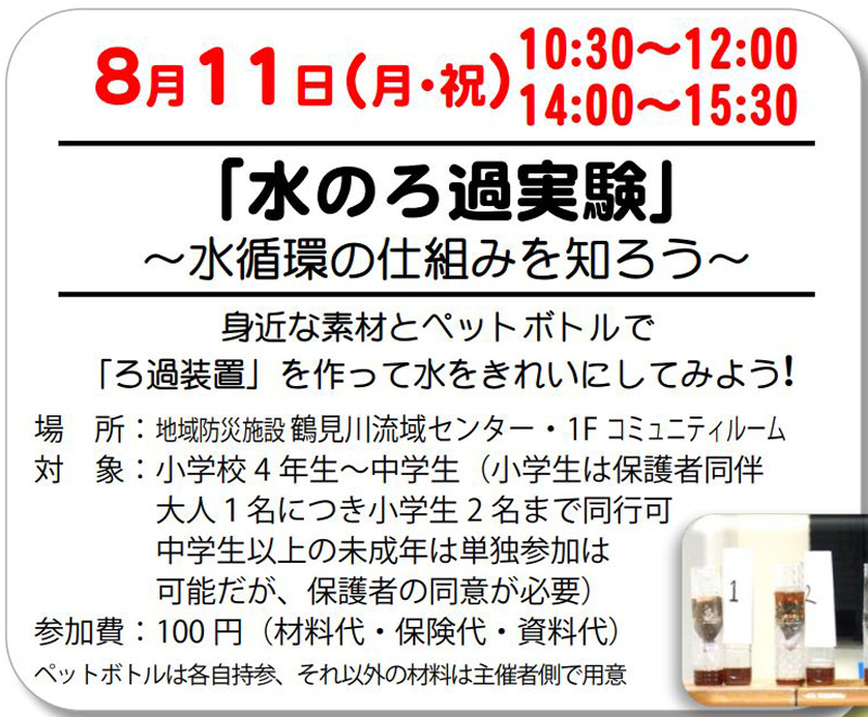 学習会「水のろ過実験~水循環の仕組みを知ろう」は8月11日(月・祝)に加え、18日(月、11:15~12:00)にも企画されている(同センター提供)