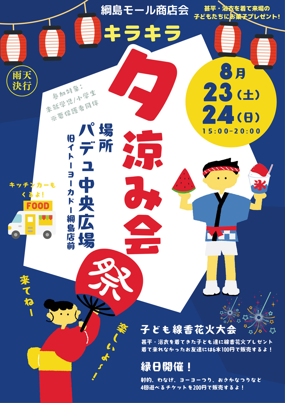 綱島西2丁目のパデュ通りなどで事業を営む約100店が所属する綱島モール商店会は、3年目となる「キラキラ夕涼み会」をあす(2025年)8月23日(土)と24日(日)の2日間にわたって「パデュ中央広場」(旧イトーヨーカドー綱島店前)で15時から20時まで開きます。
