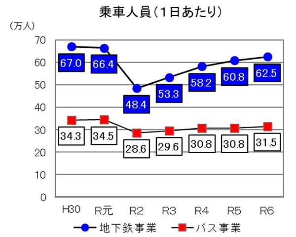 地下鉄の1日あたりの乗車人員は62.5万人と前年度比2.9%増えています。コロナ前の2019(令和元)年に記録した66.4万人にはおよばないものの、回復基調が続いています。