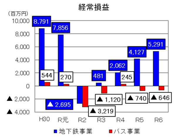 事業別に見ると、地下鉄は利用客の増加で乗車料収入が前年度から15.3億円増え、52億9100万円(前年度比11億6400万円増)の経常黒字となりました。