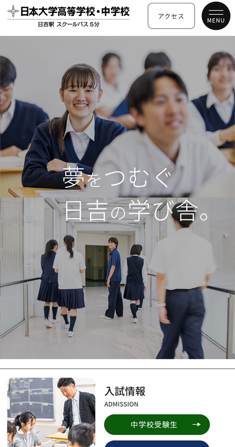 画面をジャックする冒頭写真に、“夢をつむぐ日吉の学び舎。”との文言も重ね表記するなど、より力強いメッセージ性を込めたレイアウトへの変更が行われています。