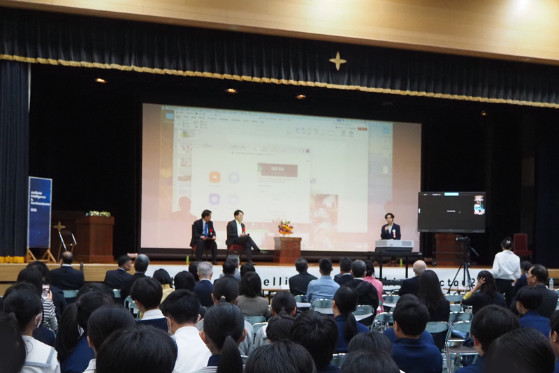 約300人の生徒が世界を代表する半導体メーカーの社長やAIの研究者、大学関係者ら約12人のプレゼンテーションやパネルディスカッションを聴講、国際社会での活躍を志す、“高き理想”を体現するかの、貴重な学びの機会を共有していました。