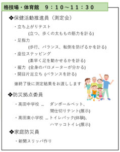 開催当日は、9時に開会宣言を行った後、保健活動推進員による立ち上がりテストや足指力、握力、座位ステッピングなどの「測定会」、家庭防災員による「新聞スリッパ作り」を格技場で行います。