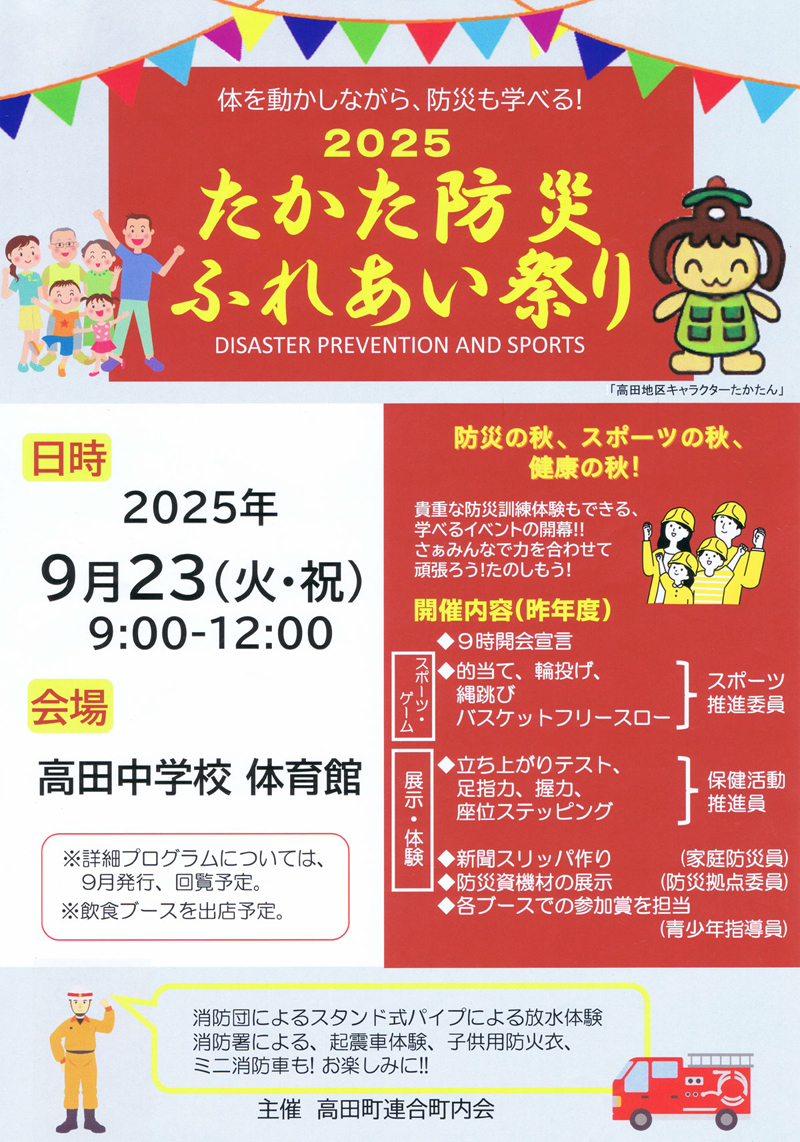 高田地区の8つの自治会・町内会からなる高田町連合町内会(相沢一夫会長=高田町内会会長)は、来週(2025年)9月23日(火・祝)9時から12時まで、「たかた防災ふれあい祭り2025」を高田中学校(高田町)の体育館をメイン会場として開催することになりました。