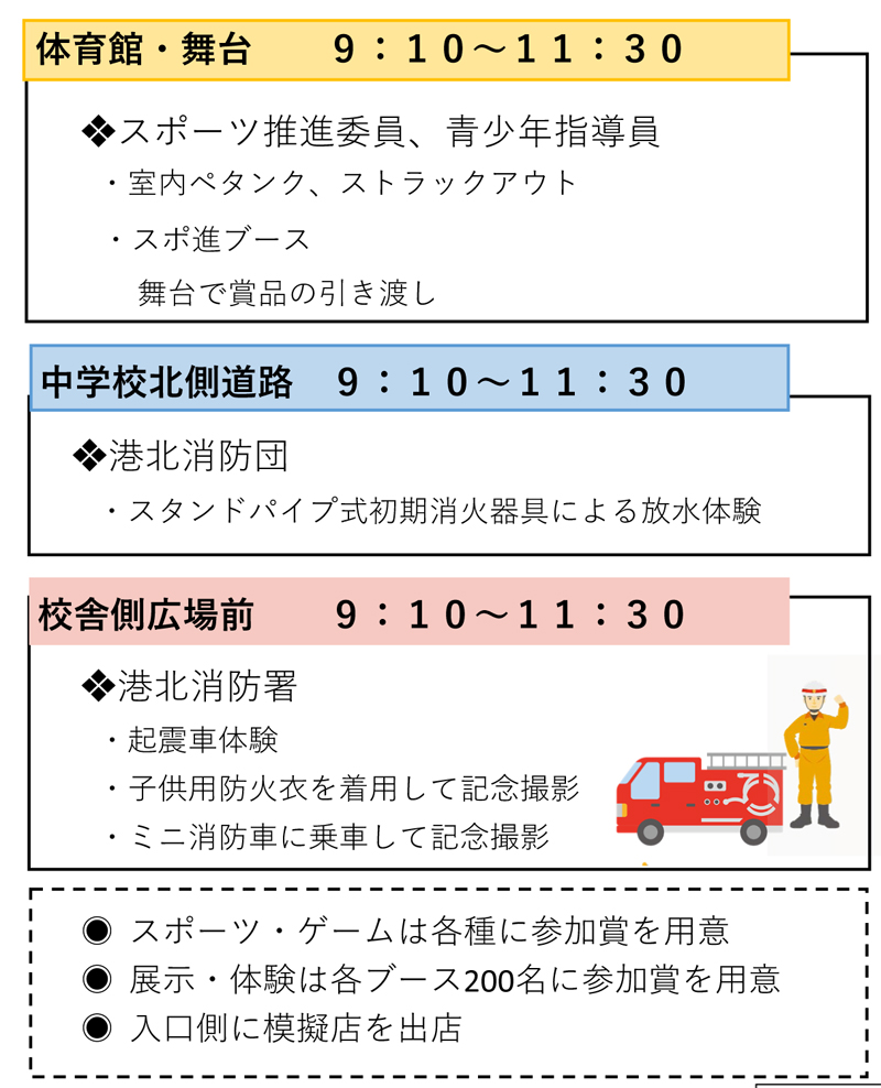 学校北側の道路では、港北消防団によるスタンドパイプ式初期消火器具による放水体験や、校舎側広場前では、港北消防署による起震車体験、子ども用防火衣の着用や、ミニ消防車に乗車しての記念撮影なども予定されています。