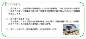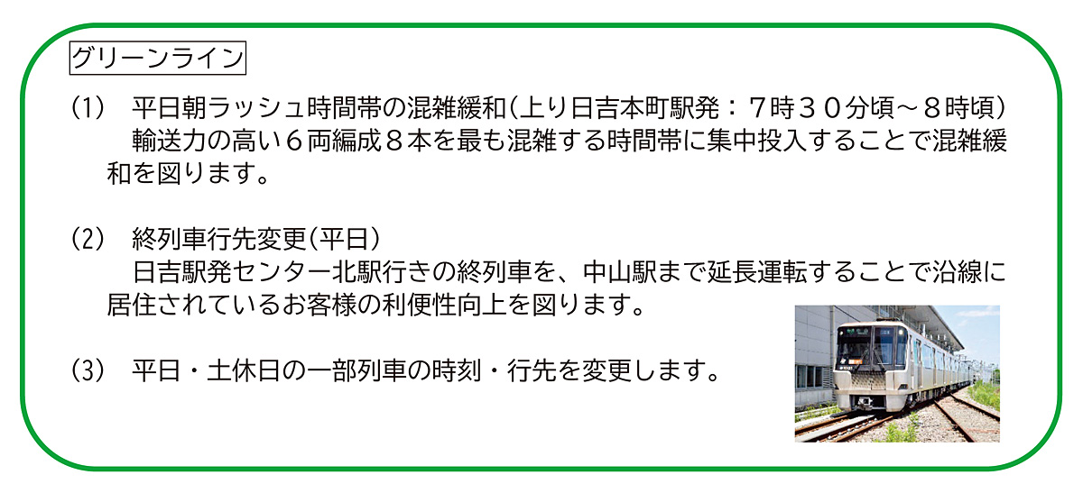 最混雑区間である日吉本町駅と日吉駅間の平日朝7時30分から8時ごろについては、現在は6両編成の列車が5本、4両編成の列車が3本という形で運行しているものを、今回の改正で8本とも6両編成での運転に変えて混雑緩和を図ります。