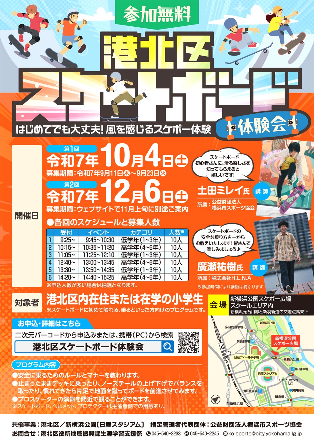 なお、港北区スケートボード体験会は12月6日(土)に第2回が予定されており、こちらは11月上旬に参加者募集が行われる予定です。