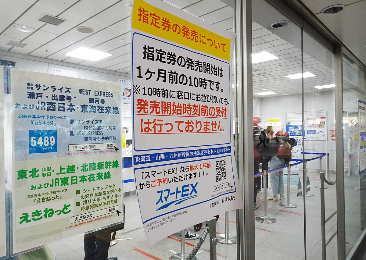 JR新横浜駅に置かれているJR東海の有人チケット販売窓口。今は営業時間を縮小するとともに、JR東日本やJR西日本のインターネット予約サービスの案内まで掲出しており、有人窓口を縮小したいのはJR各社共通の思いのようだ(2025年5月)