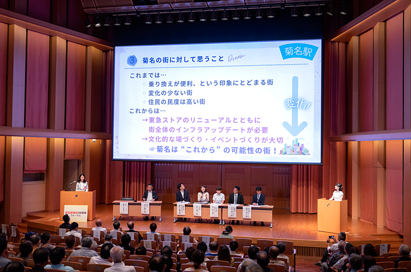 フォーラムでは、東急の社史担当者による歴史概説と、専門家3氏による港北区内5駅の歴史解説に続き、パネルディスカッションを開始。ここで登壇した高木学園理事長・英理女子学院(菊名7)校長の高木暁子さんと、松栄建設株式会社(菊名1)・妙蓮寺ニコニコ会副会長の酒井洋輔さんの発言を中心にまとめました。
