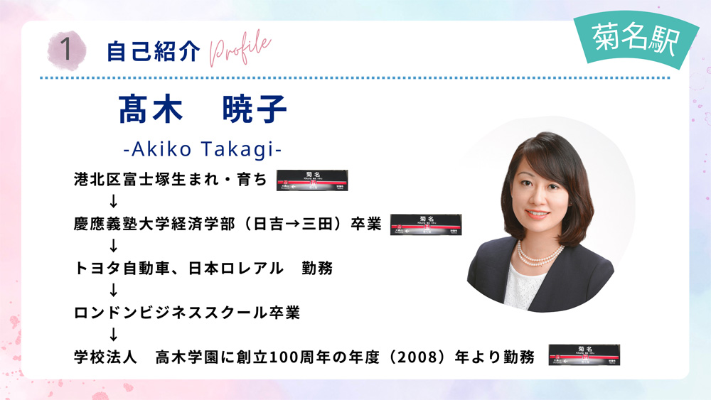 みなさまこんにちは、菊名で生まれ育ち、そして現在も菊名で仕事をさせていただいております学校法人高木学園の高木暁子と申します、どうぞよろしくお願いいたします。