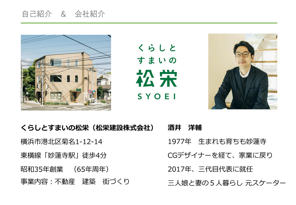 簡単な自己紹介と会社紹介をさせていただきます。弊社は「くらしとすまいの松栄」(松栄建設株式会社、菊名1丁目)という会社で、主な事業は不動産と建築と、あとは「まちづくり」をやっています。