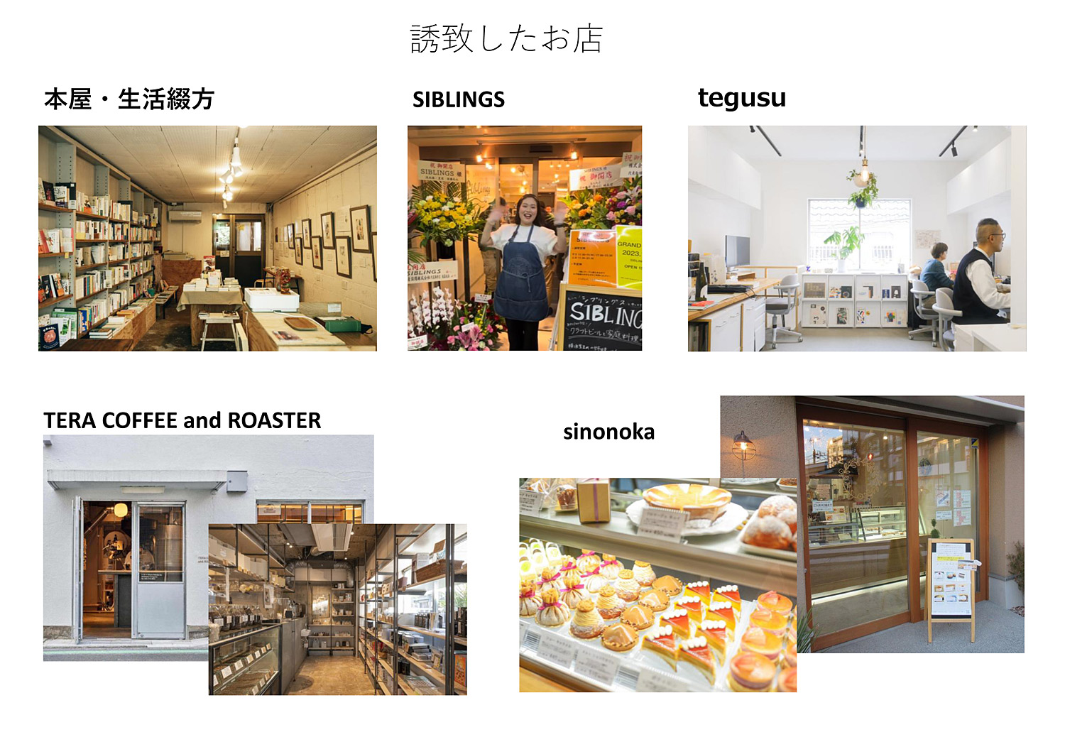 街に誘致したお店もありまして、ご紹介しますと、スライドの左上が「本屋・生活綴方(つづりかた)」と言って、中岡さんという方(妙蓮寺に拠点を置く出版社「三輪舎」の中岡祐介代表)が立ち上げた本屋さん(石堂書店の向かい、2020年~)なんですが、今ここがわざわざ九州や北海道からお客さんが来るお店になっています。