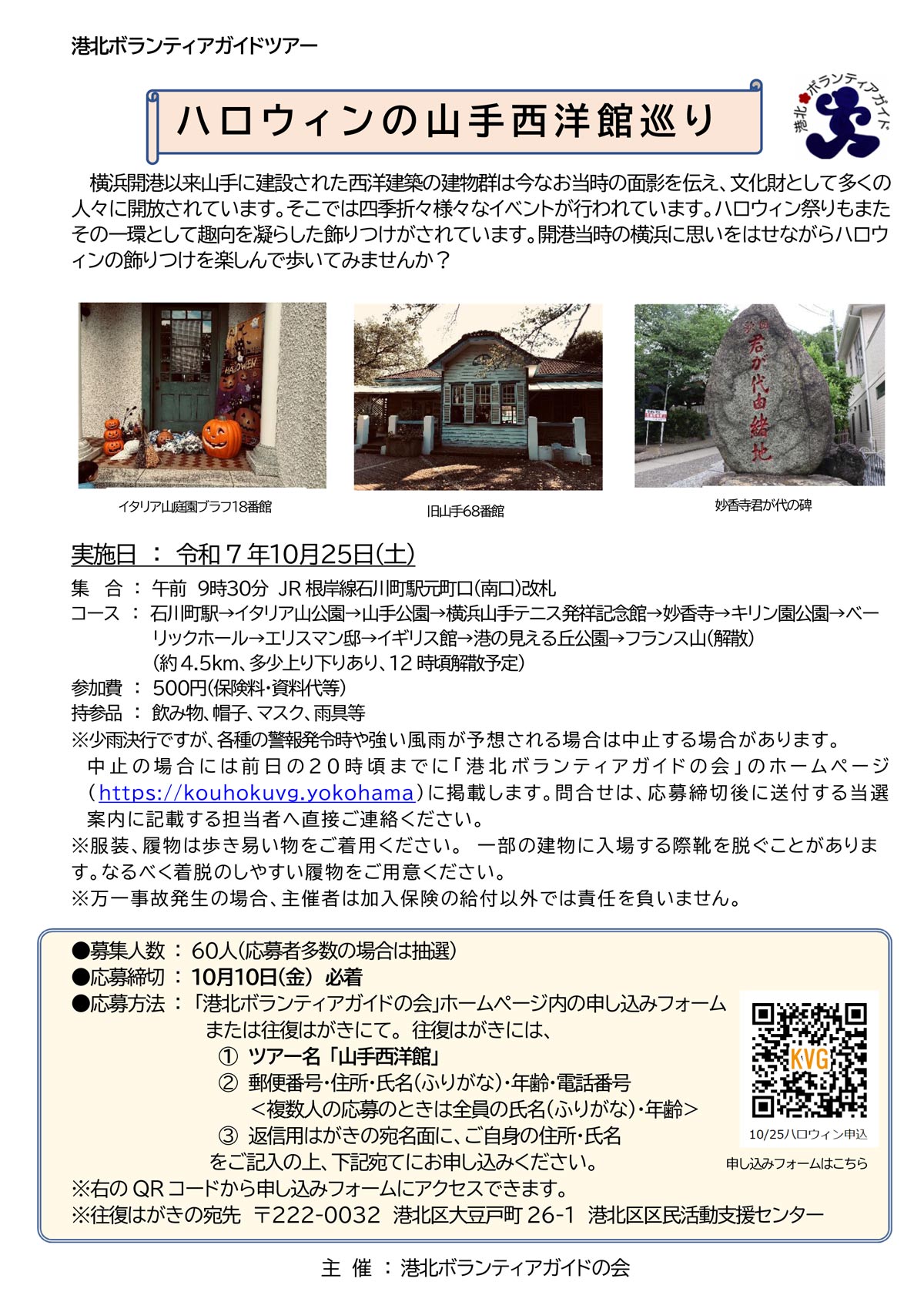 港北ボランティアガイドの会は、今月(2025年)10月25日(土)午前中にウォーキングツアー「ハロウィンの山手西洋館巡り」を企画し、参加者60人を10月10日(金)まで募集中です。