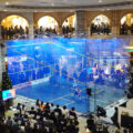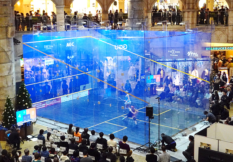 トレッサ横浜の北棟「リヨン広場」にはガラス張りのスカッシュコートが特設され、11月15日(土)に男女準決勝、16日(日)は男女決勝戦が行われる(2023年11月の第52回大会時)