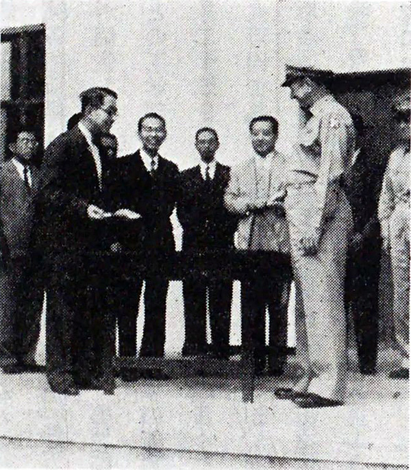 終戦後すぐに米軍が接収した日吉キャンパス、慶應義塾に戻ったのは1949(昭和24)年のことで、キャンパスは4年にわたって米軍の施設となっていた。同年10月に行われた「返還式」の様子(1968年「慶応義塾百年史 下巻」より)