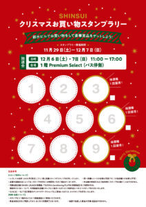 ・クリスマスお買い物スタンプラリー(抽選会は12月6日・7日、税込1000円でスタンプ1つ、3つで抽選に1回参加が可能)