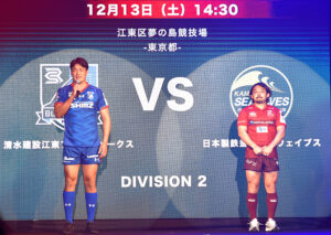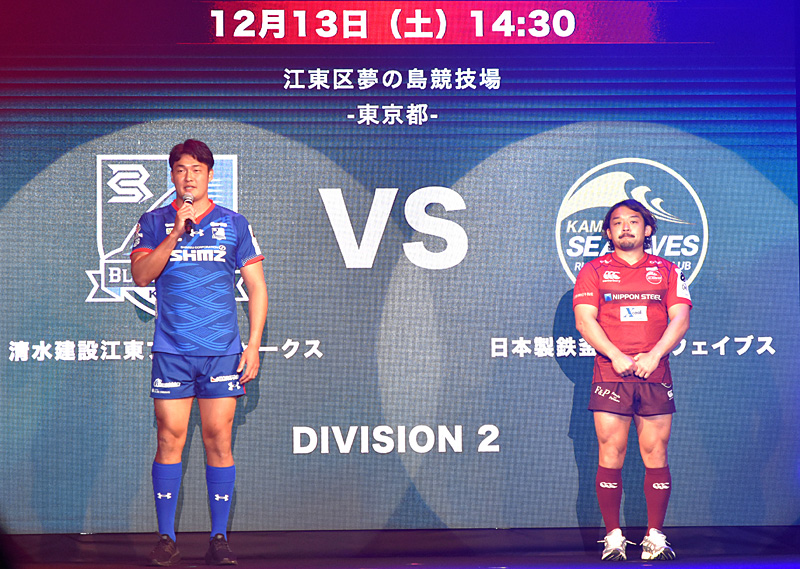 都筑区の拠点で活動していることが多い清水建設江東ブルーシャークスの開幕戦は、本拠地の「江東区夢の島競技場」に日本製鉄釜石シーウェイブスを迎える。写真はブルーシャークスの安達航洋選手(左)とシーウェイブスの小野航大選手(12月2日)