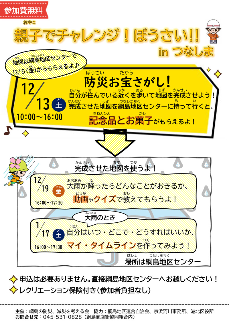綱島地区で活動を行う「綱島の防災、減災を考える会」は、あさって(2025年)12月13日(土)10時から16時まで、「親子でチャレンジ・ぼうさいinつなしま」イベントを初めて企画、当日の参加を呼び掛けています。