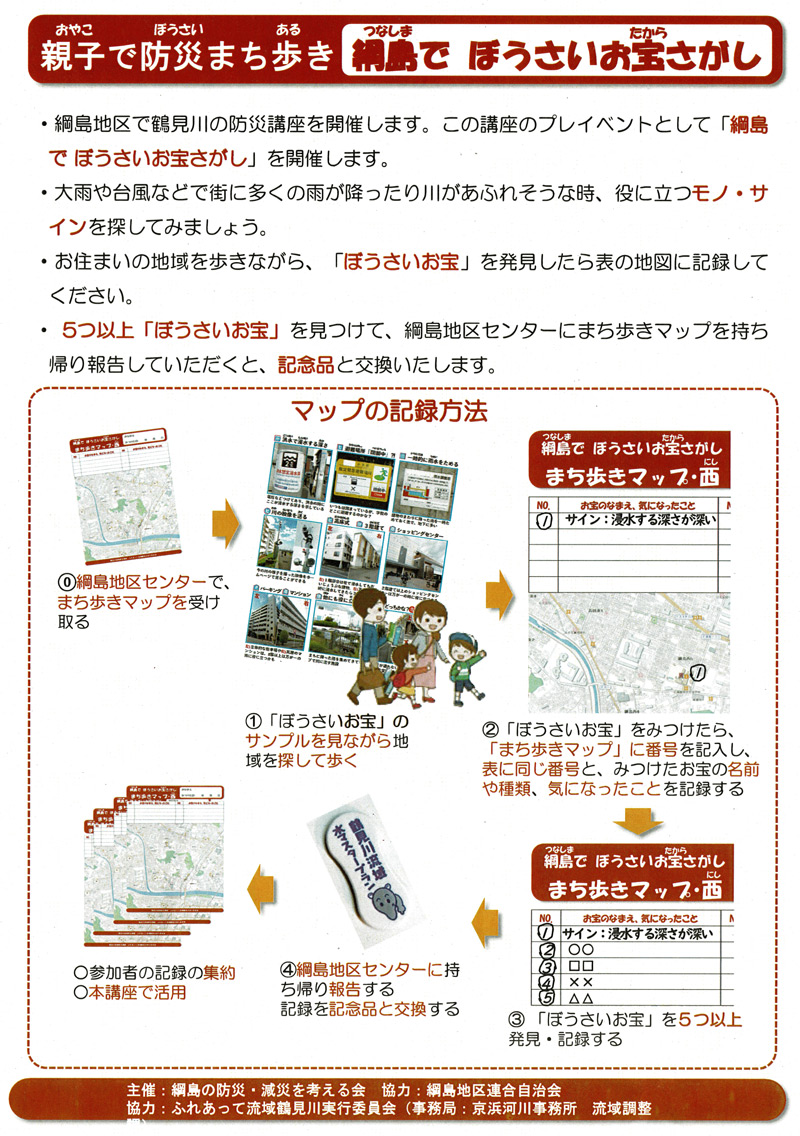 今回の「お宝さがし」イベントは、綱島地区で地域防災活動をおこなう「家庭防災員連絡協議会」のメンバーが中心となって行うもので、開催にあたり綱島地区連合自治会や綱島商店街協同組合、鶴見川流域で活動を行う「ふれあって流域鶴見川実行委員会」(事務局:国土交通省京浜河川事務所)が協力。