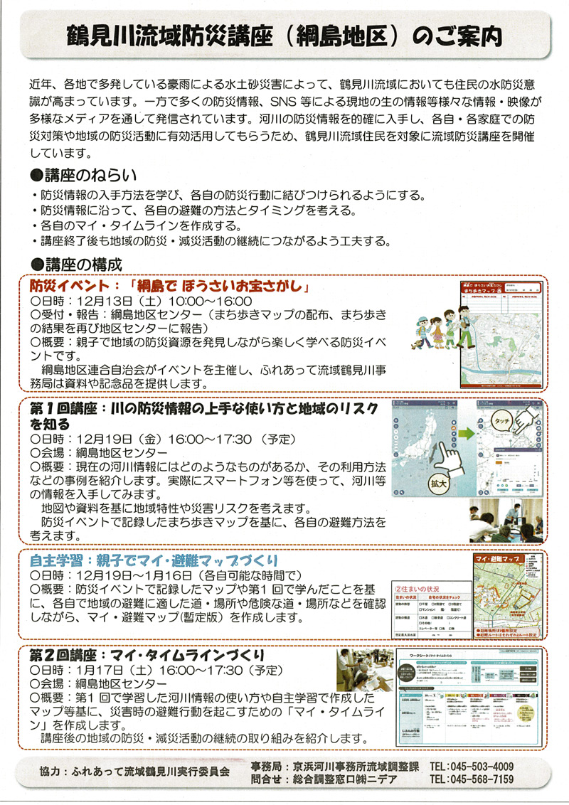 「防災講座」についての問い合わせは、「ふれあって流域鶴見川実行委員会」の総合調整窓口(株式会社ニデア:045-568-7159)まで。