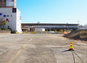 地上から見た新横浜駅前の市有地、奥にあるのは新幹線のホーム。1970年代のブーム時に高島屋がボウリング場を設け、その後は家具店として長年運営していたが、市が入手してからは仮設の建物しか建っていない。1999(平成11)年に市が策定した「新横浜都心整備基本構想」にともなって取得したと言われる。現在は新綱島の再開発にともない発生した土砂などの置場として暫定的に使用中(2025年12月)