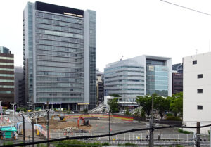 東海道新幹線の東京方面行ホームから見た市有地、環状2号線をはさんで奥に建つのは18階建てのオフィスビル「新横浜スクエアビル」(2025年6月)