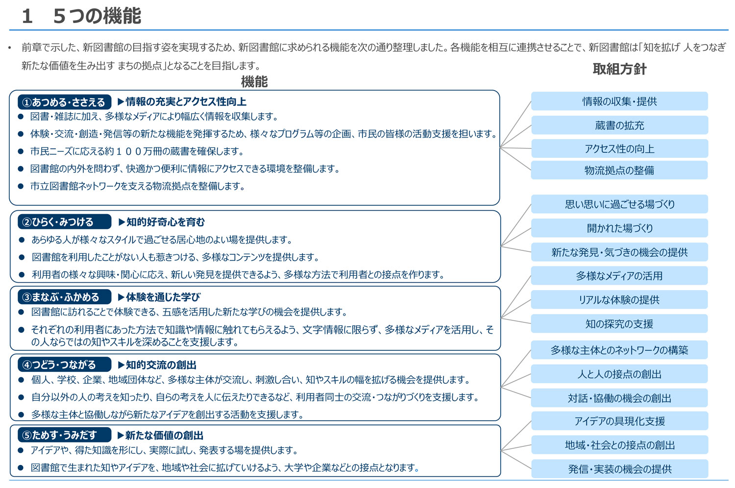 新図書館に求められる5つの観点からの機能、図書・雑誌に加え多様なメディアによる情報収集や100万冊の蔵書確保などを打ち出している(横浜市会「こども青少年・教育委員会」2025年12月15日資料より)