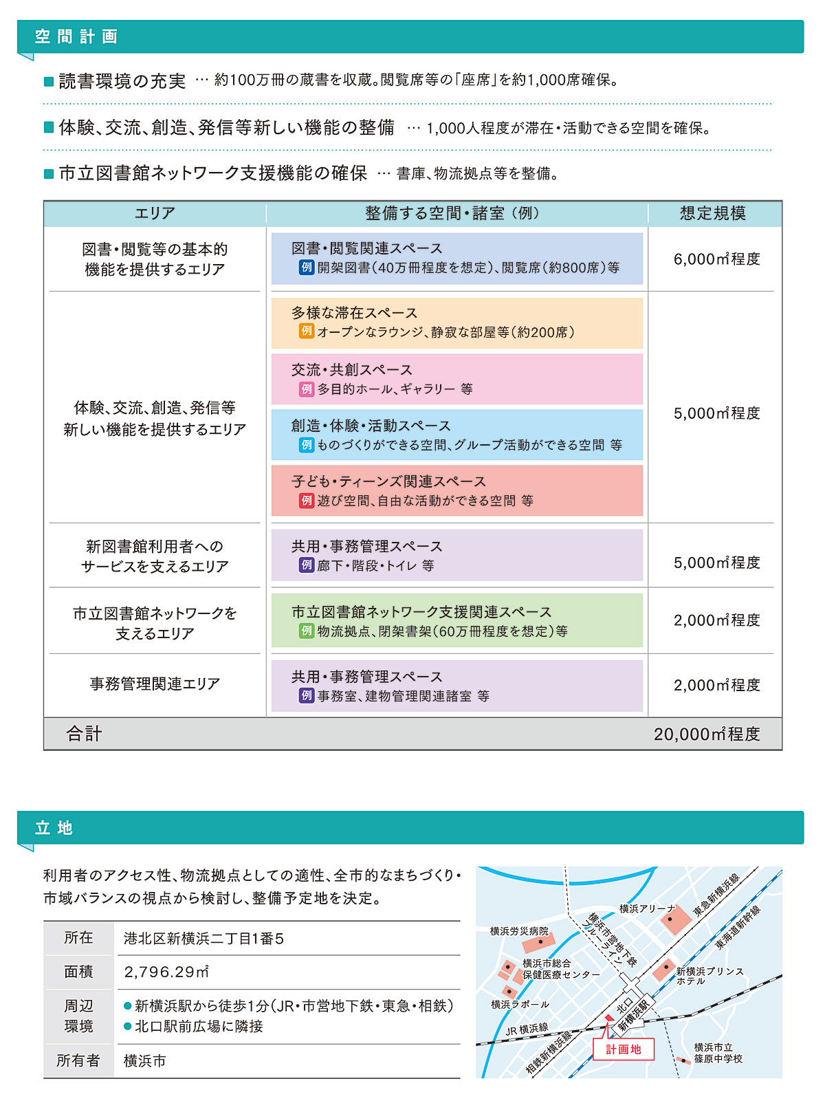 新図書館の空間計画では約2万平方メートルの館内には閲覧席など1000席と1000人が滞在・活動できる空間を確保すると打ち出す。画像下部は建設予定地の位置図(「横浜市新図書館整備基本構想(素案)」概要版より)