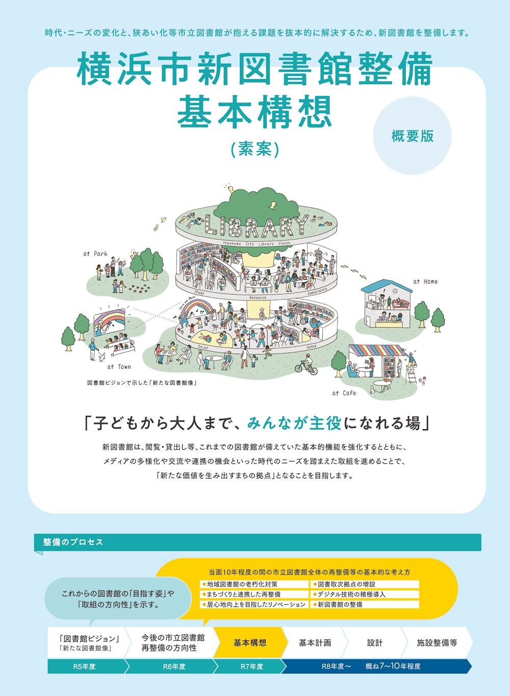 12月15日に公表された「横浜市新図書館整備基本構想(素案)」に対し、12月17日(水)から2026年1月19日(月)まで市民意見の募集が行われる(画像は概要版、市の発表資料より)