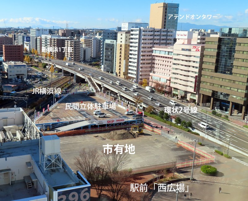 地上から見た新横浜駅前の市有地、奥にあるのは新幹線のホーム。1970年代のブーム時に高島屋がボウリング場を設け、その後は家具店として長年運営していたが、市が入手してからは仮設の建物しか建っていない。1999(平成11)年に市が策定した「新横浜都心整備基本構想」にともなって取得したと言われる。現在は新綱島の再開発にともない発生した土砂などの置場として暫定的に使用中(2025年12月)