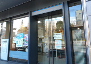 綱島街道側に出入口のある「日吉駅行政サービスコーナー」、2027(令和9)年度末となる2028年3月に廃止が決まった。一番目立つ場所に住民票はコンビニで手続きできることを知らせるポスターが貼られている(2025年12月)