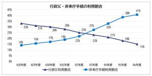 「行政サービスコーナー」と「非来庁手続」の利用割合の推移、2021(令和3)年度以降は非来庁手続のほうが多くなっている(横浜市会「市民・にぎわいスポーツ文化・消防委員会」2025年12月12日資料より)