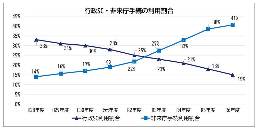 マイナンバーで行政間の情報連携が進み、住民票の提出が不要になる手続きが増えたことや、コンビニ交付をはじめとした「非来庁手続」が2024年度に41%を占めるなど、行政サービスコーナーの役割が低下しているとのこと。