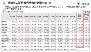 証明書の発行数は10カ所中6番目と極端に少ないわけではありませんが、過去10年間の減少率が56.4%と最大の減り幅で、利用者が6割近く減ったことになります。また、証明書1枚あたりの発行コストを算出すると990円とワースト3位の数字だったとのこと。