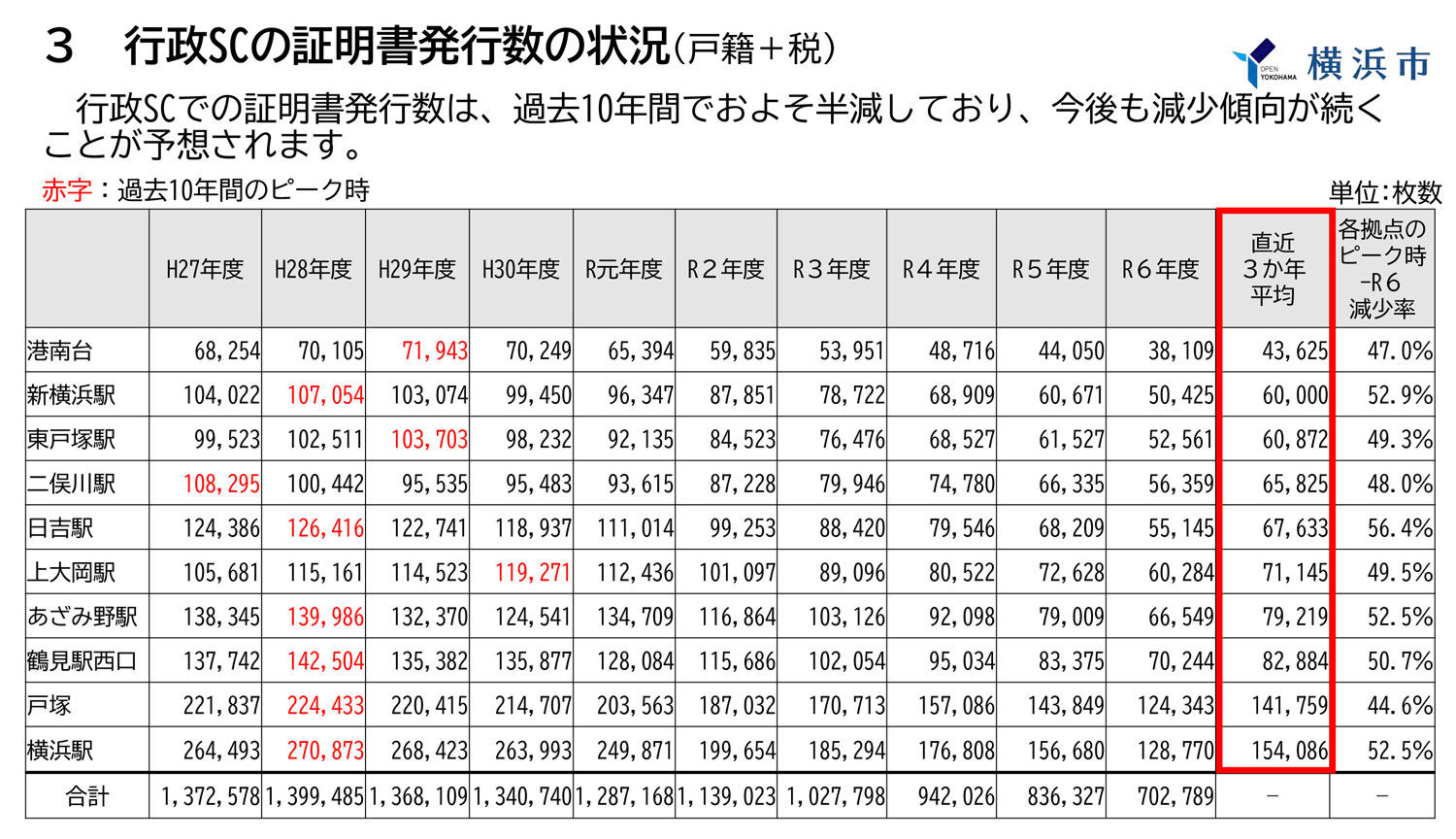 そのため、証明書発行数がもっとも多い「横浜駅行政サービスコーナー」(西区)と、次に多い「戸塚行政サービスコーナー」(戸塚区)を除き、新横浜駅や日吉駅など次の8カ所を3年かけて廃止することを決めています。