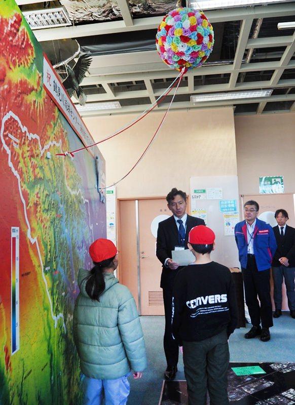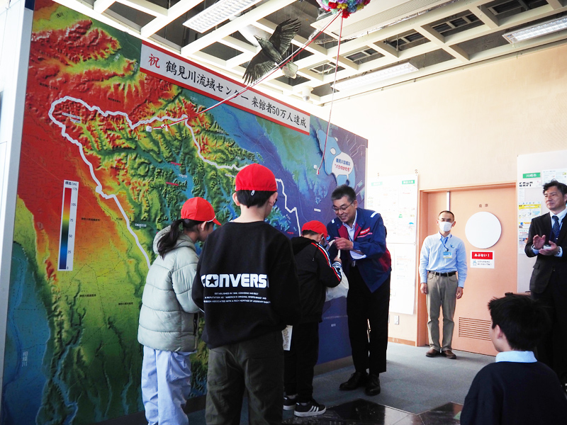 大野光秀センター長(京浜河川事務所事業対策官)から、同クラスに対する「来場者50万人認定証」と、鶴見川流域の形から生まれたキャラクター「バクちゃん」のぬいぐるみ、来館記念の特製バッジが贈られ、50万人の達成を祝う瞬間を、国土交通省の職員やスタッフらと共有しました。