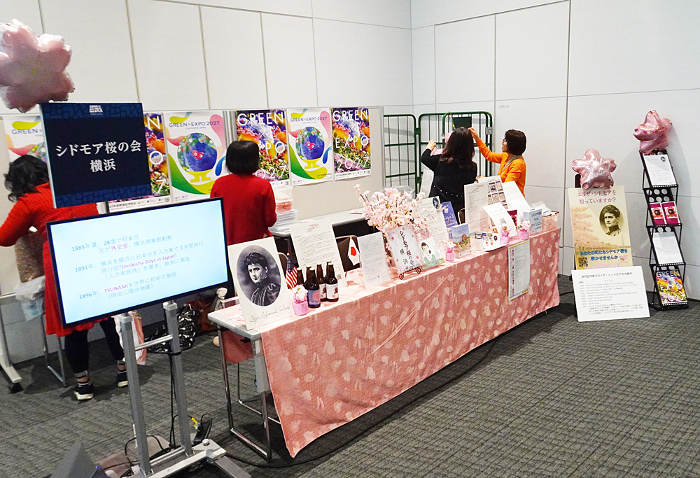 「シドモア桜の会 横浜」のブース、シドモア桜は米国の地理学者・文学博士・ジャーナリスト・写真家で横浜の地に永眠するエリザ・シドモア(1856~1928年)が米国で桜の植樹を提唱したことをきっかけにワシントンD.C.に桜が植えられ、日米友好の架け橋として横浜に“里帰り”した桜のこと(12月20日)