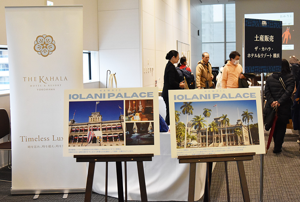 パシフィコ横浜に隣接する「ザ・カハラ・ホテル&リゾート横浜」は、ハワイ・オアフ島で著名ホテル「ザ・カハラ・ホテル&リゾート」を運営していることからオアフ島・ホノルルの宮殿を紹介するとともに土産品を販売(12月20日)