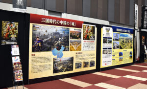 同社の著名ゲーム「信長の野望」と「三國志」に関連し、戦国時代における日本の城と、三国時代に見られた中国の城がそれぞれ学べるオリジナルの大型パネルを設置し、通行者の注目を集めていました。