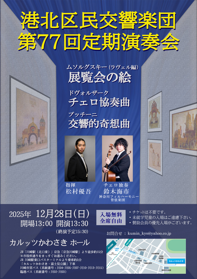 今回は、イタリアの作曲家・プッチーニの「交響的奇想曲」やドヴォルザークの「チェロ協奏曲」、クラシックファンの人気も高いムソルグスキー(ラベル編)の組曲「展覧会の絵」という演奏プログラム。