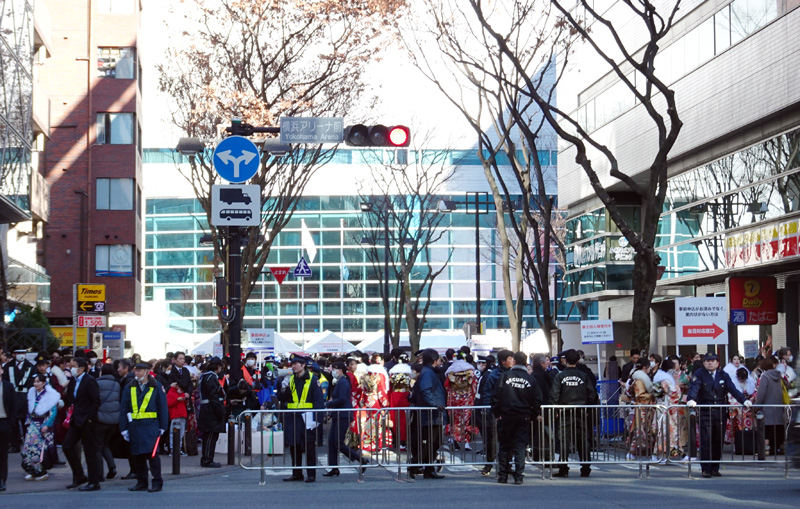 旧成人式の時代から全国最大規模の式典とされており、当日は着付けを行うホテルをはじめとして新横浜の街が大混雑します。会場周辺は交通規制と入場規制が行われ、参加対象者以外は横浜アリーナの玄関前へ近づくことができなくなります。